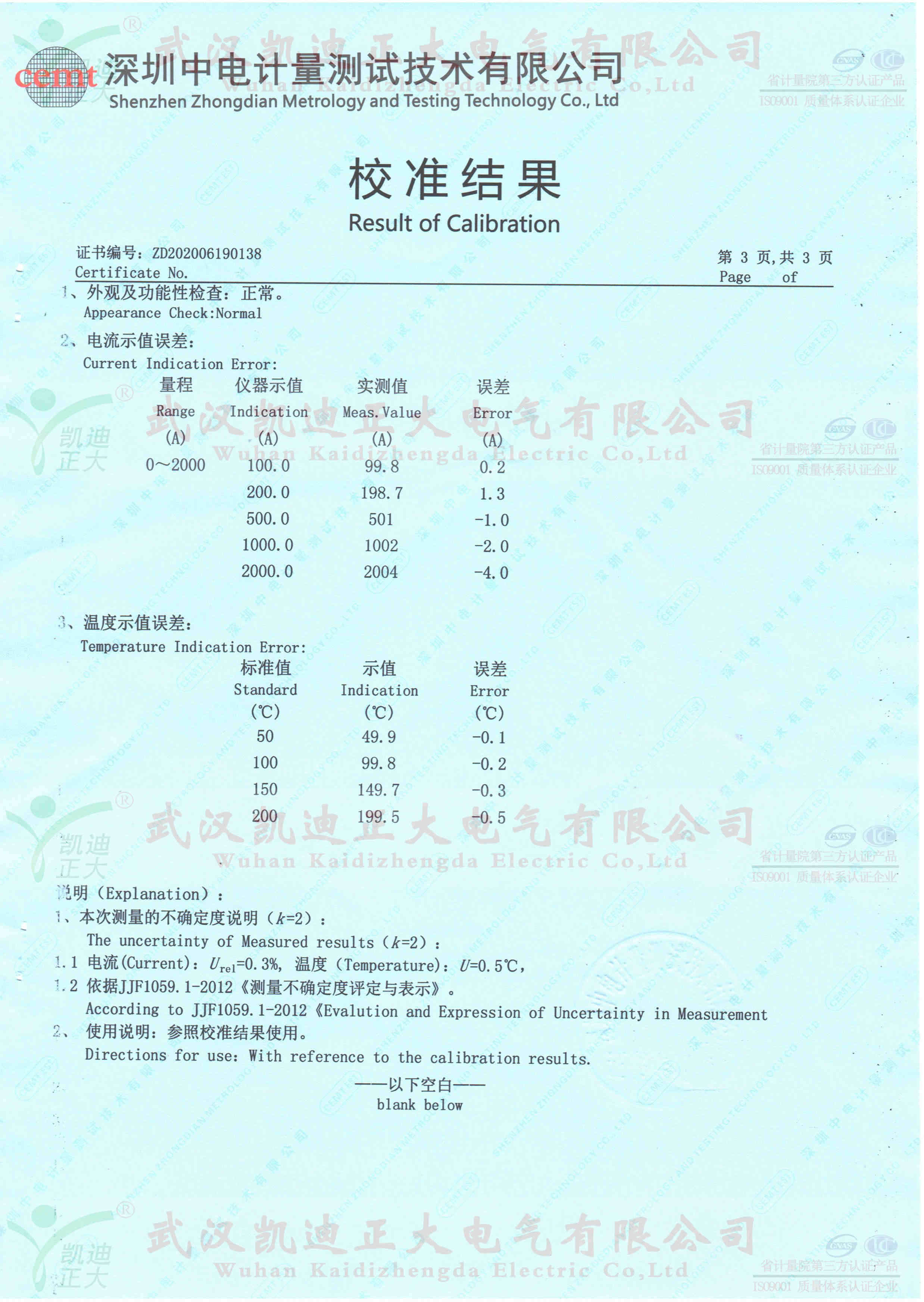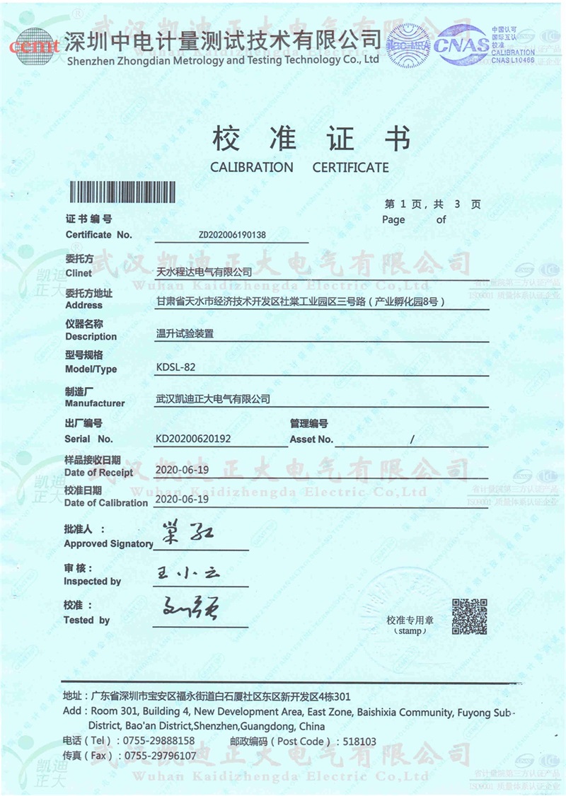 這次擔(dān)任我司檢測(cè)服務(wù)的是深圳中電計(jì)量測(cè)試技術(shù)公司,KDSL-82溫升試驗(yàn)裝置2000A,證書編號(hào):ZD202006190138,校準(zhǔn)證書合格。