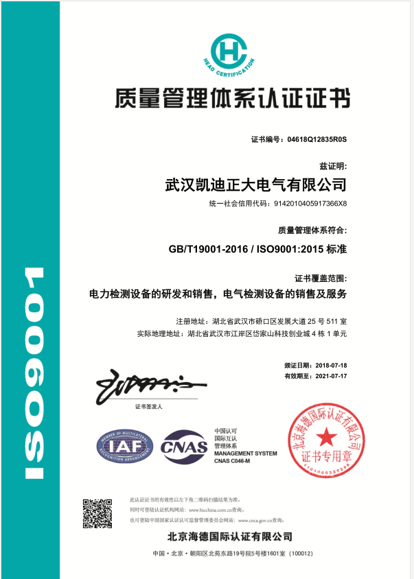 證書覆蓋范圍:電力檢測設(shè)備的研發(fā)和銷售,電氣檢測設(shè)備的銷售及服務(wù)