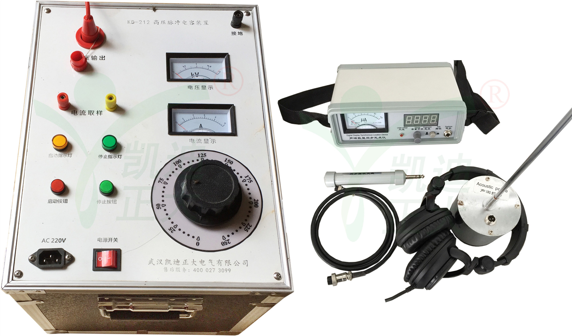 KD-212整套電纜故障測試儀由閃測、尋跡、定位三大部分組成。電纜故障測試儀(閃測儀)可用于檢測電纜尋跡及故障定點是由路徑儀、定點儀、T型探頭、A字架、聽筒等組成。本儀器是電纜故障定位測試的專用儀表,適用測試對象為具有金屬導體(線對、護層、屏蔽層)的各種電纜。其主要功能為對地絕緣不良點的定位測試,線纜路徑的探測以及線纜埋深的測試。
