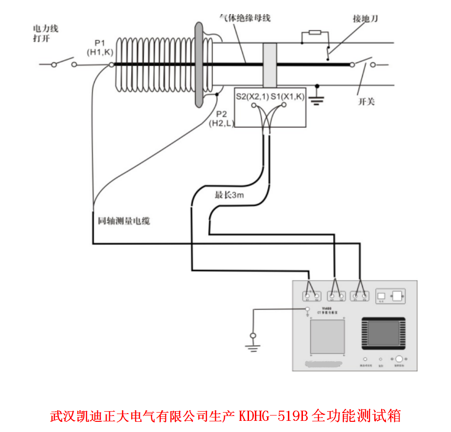 KDHG-519S多功能Engine開關柜低壓開關專用測試儀:連接KDHG-519S多功能Engine開關柜低壓開關專用測試儀的等電位地端子到保護地。 解開負載與CT的S1(X1,K)的連線。連接CT參數分析儀 的“S1、S2”及“U1、U2” 測量輸入端口Ⅰ到解開的負載端和CT的二次側端子 S2 (X2, l))。
