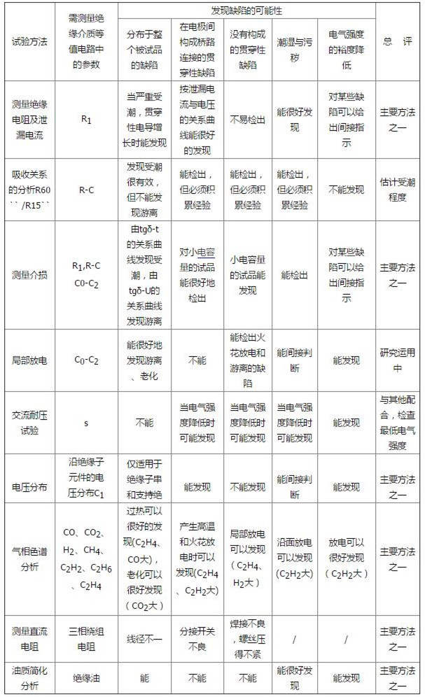 從表中可見,每種試驗方法都只能發現某一方面的絕緣缺陷,因此,單靠一種試驗方法,有時很難判斷絕緣好壞,須根據各種試驗方法的特點和試驗結果,相互比較與補充,力求作出準確的判斷。這就要求我們在實際工作中,掌握各種試驗方法,注意提高綜合試驗分析的能力。