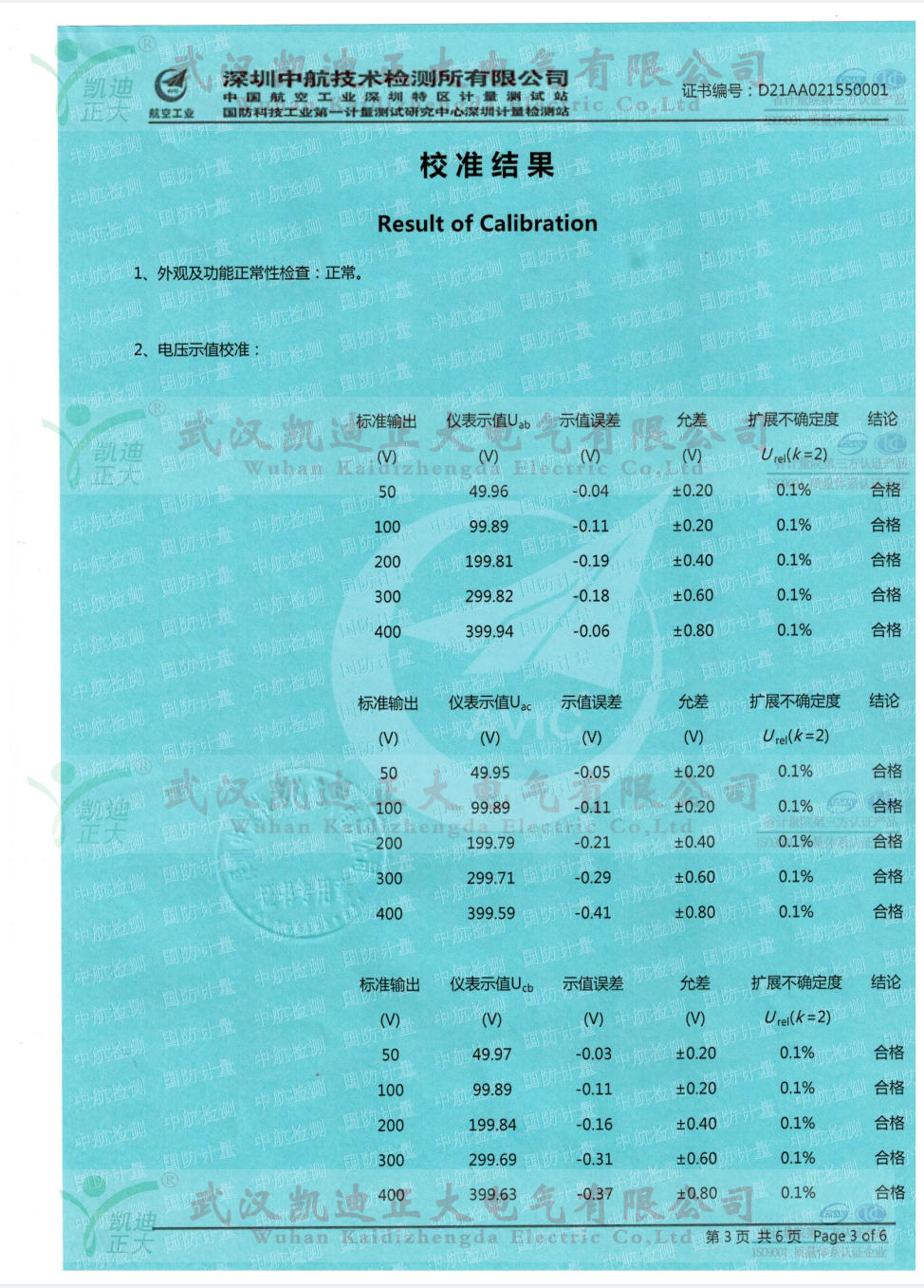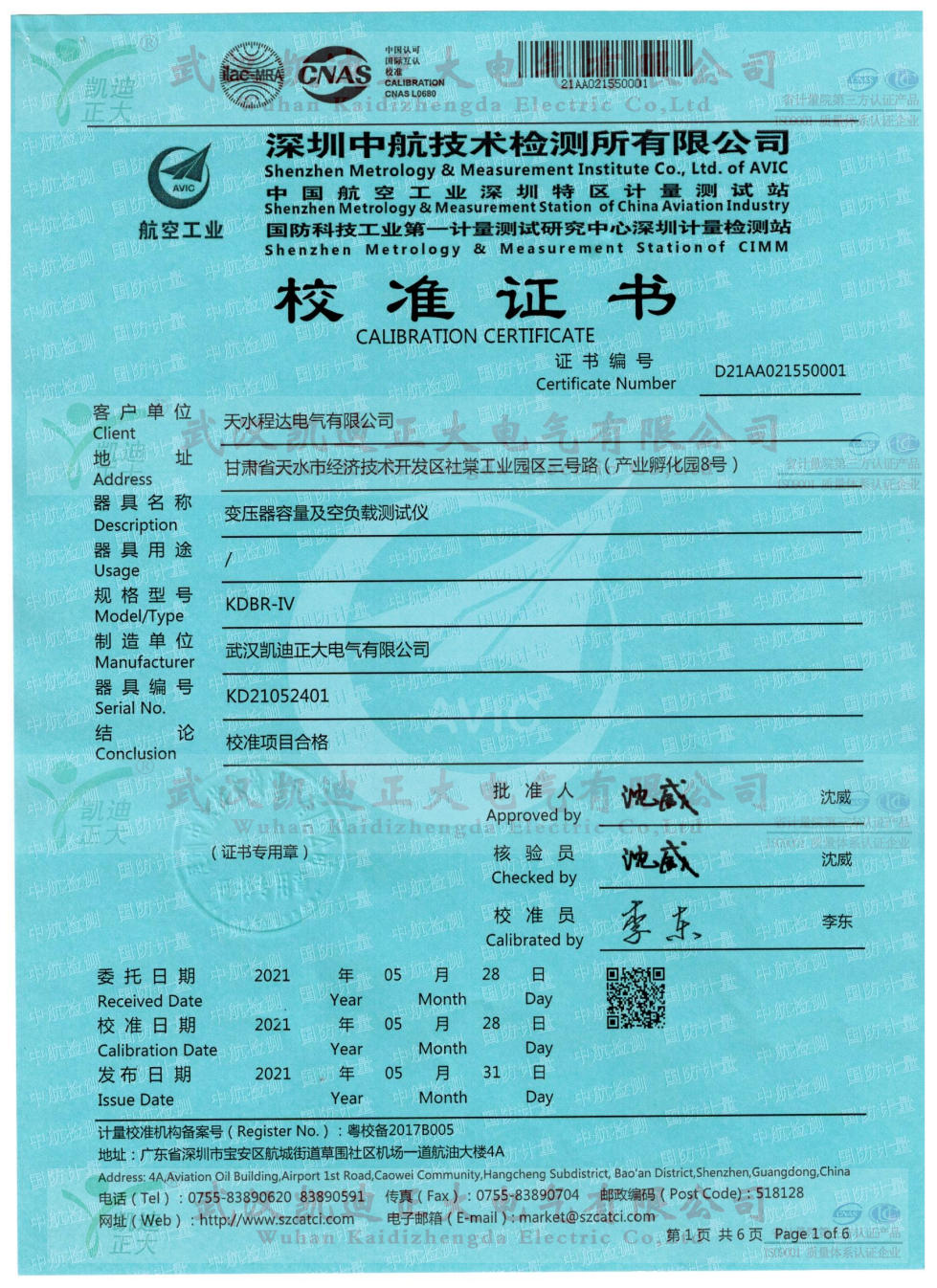 KDBR-IV變壓器容量及特性測(cè)試儀是我司老客戶(hù)天水程達(dá)電氣再次采購(gòu)的,因多次為質(zhì)檢所等相關(guān)單位提供高低壓成套檢測(cè)設(shè)備,所以程達(dá)電氣對(duì)我司產(chǎn)品青睞。應(yīng)要求需要出具中國(guó)合格評(píng)定國(guó)家認(rèn)可委員會(huì)(CNAS)相關(guān)單位的電壓示值校準(zhǔn)、電流示值校準(zhǔn)、功率示值校準(zhǔn)等數(shù)據(jù)。深圳中航技術(shù)檢測(cè)大多數(shù)限公司(中國(guó)航空工業(yè)深圳特區(qū)計(jì)量測(cè)試站/國(guó)防科技工業(yè)第一計(jì)量測(cè)試研究中心深圳計(jì)量檢測(cè)站 )是航空工業(yè)北京長(zhǎng)城計(jì)量測(cè)試技術(shù)研究所、國(guó)防科技工業(yè)第一計(jì)量測(cè)試研究中心于1986年投資建立的計(jì)量技術(shù)檢測(cè)服務(wù)機(jī)構(gòu),是深圳市最早的法定計(jì)量檢測(cè)機(jī)構(gòu)之一,是具有法定計(jì)量、國(guó)防計(jì)量、軍用計(jì)量屬性的第三方公正實(shí)驗(yàn)室。