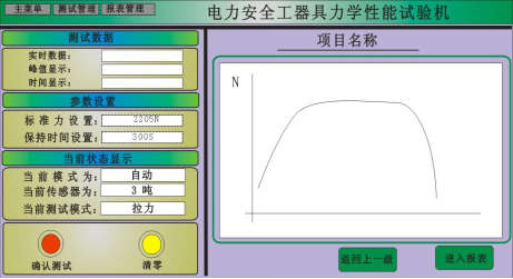 參數設置。這里要特別查看(當前狀態(tài)顯示)的內容,確認是否是自動模式,傳感器是否符合試驗的量程,還有是否是拉力測試,確認無誤后再做下面的事情;清零按鈕用于清除初始值。然后點擊確認測試按鈕開始測試,但系統(tǒng)力值到達設定值的20%時,系統(tǒng)會自動停止,此過程為預緊過程,若此過程有出現較大的變動,可能由于夾具沒夾緊,此時試驗人員可根據具體的現象進行檢查,若沒有問題試驗人員用鼠標點擊繼續(xù)測試,設備繼續(xù)加載力值,測試數據欄中會顯示當前狀態(tài)的受力情況,當拉力力值達到設置的力值時,開始自動計時,設備開始保持力,力值不過沖。同時右邊的實時曲線將記錄實時力值與時間的曲線。計時完成后設備自動卸載力,關閉電磁閥,關閉油泵,測試結束。鼠標點擊進入報表按鈕進入報表界面。
