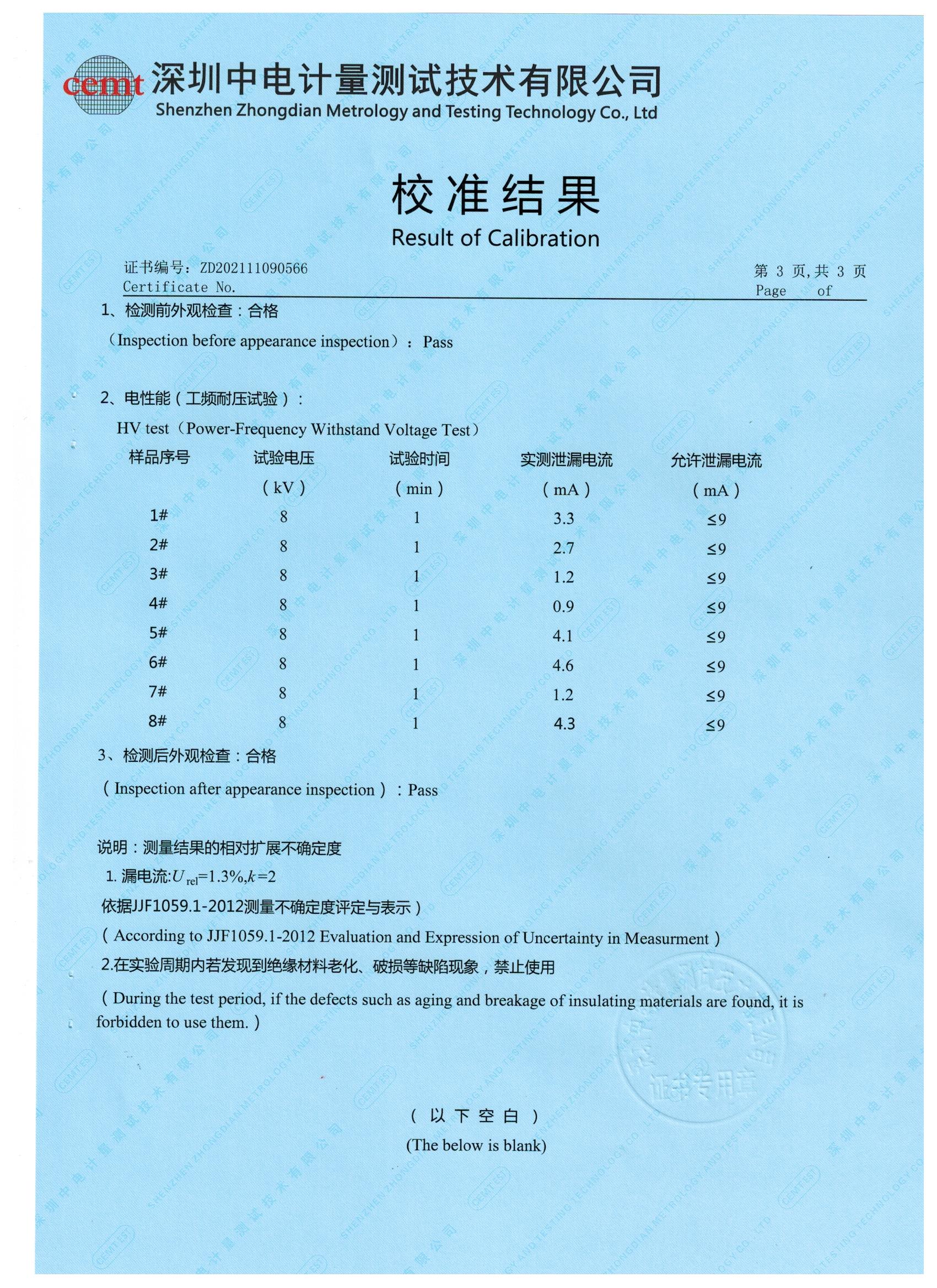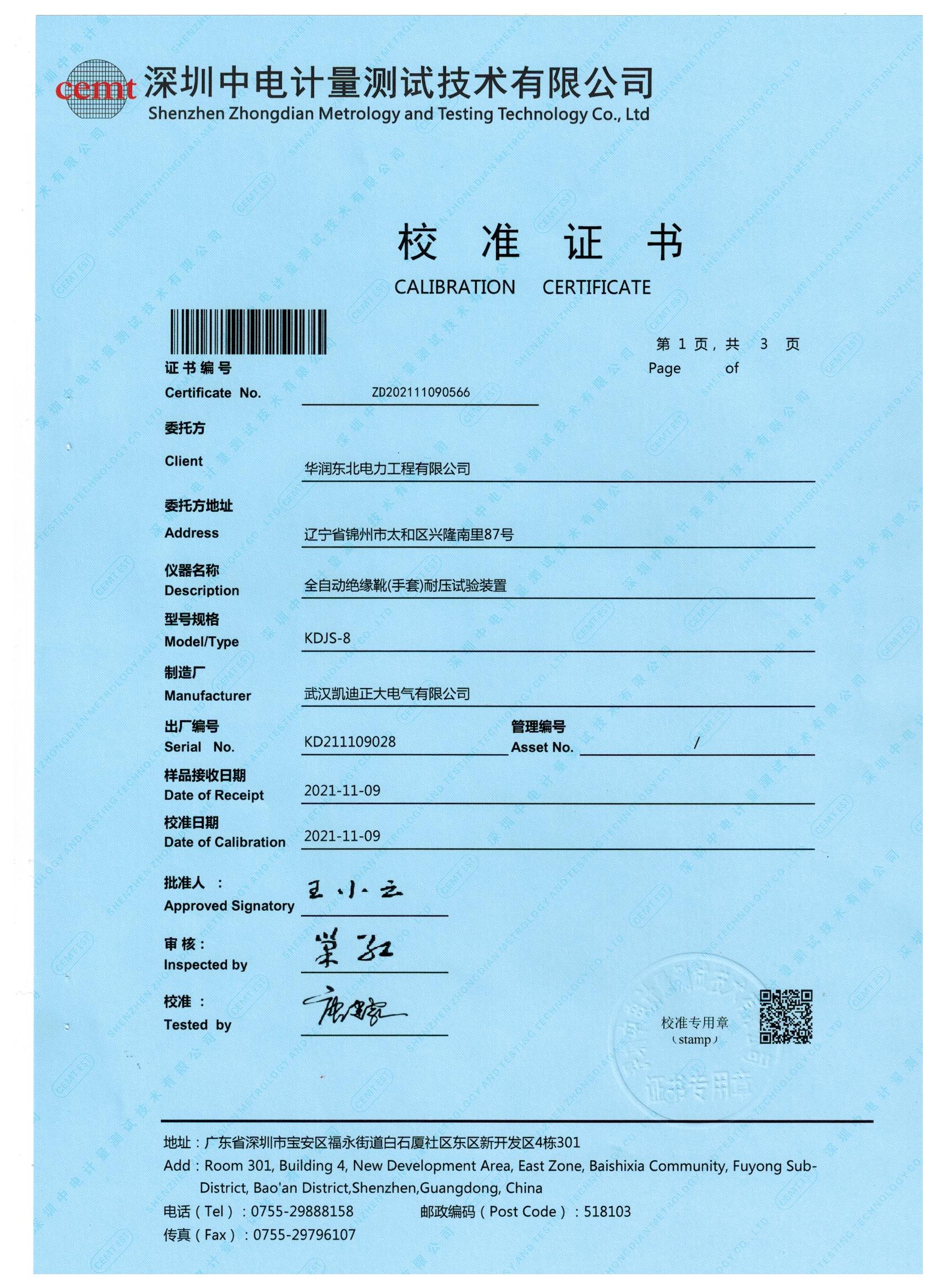 日前,華潤東北電力工程有限公司采購我公司一批自動絕緣靴耐壓試驗裝置,油浸式交直流試驗變壓器,數字高壓表等產品,經深圳中電計量測試技術有限公司校準和檢測,產品幾乎符合國家標準,最終合作圓滿成功。