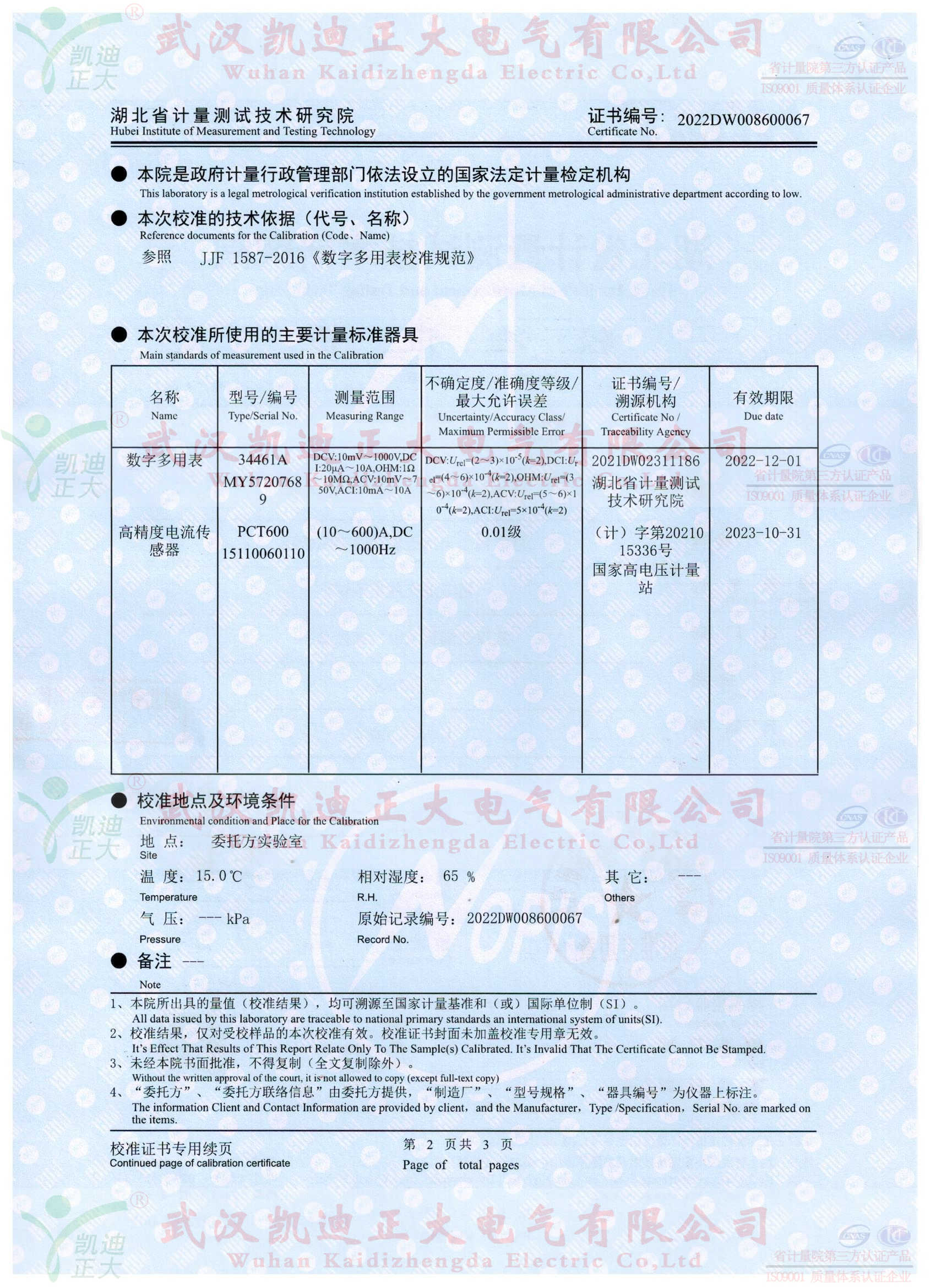 生產KDZD886完成后,送往省計量院。在校準證書顯示:采用國家高電壓計量站(計)字第2021015336號溯源機構的高精度電流傳感器及數字多用表檢定電壓示值誤差U=0.2V;電流值U=0.1A的結果值,符合國家相關標準,滿足測量不確定度。