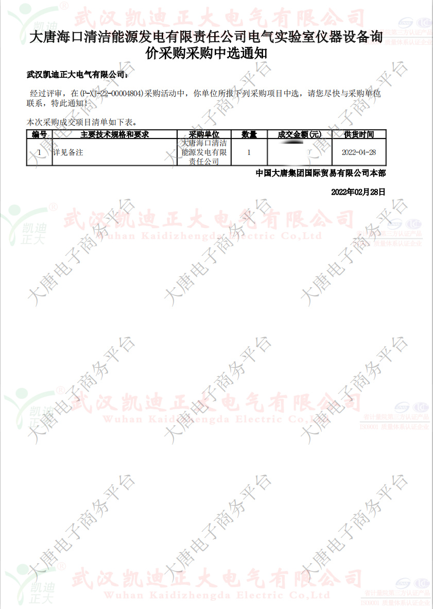 遲日江山麗,春風花草香。祝賀我司商務部再次接到中國大唐海口清潔能源發電有限責任公司電氣實驗室儀器設備詢價采購采購中選通知。