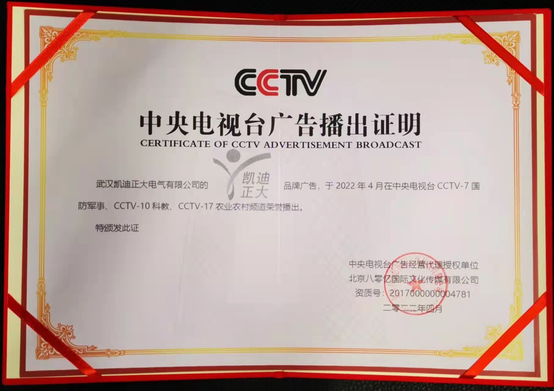 2022年4月,武漢凱迪正大電氣有限公司品牌廣告正式登陸中央電視臺CCTV-7國防軍事頻道、CCTV-10科教頻道及CCTV-17農業農村頻道,向全國觀眾展示武漢凱迪正大的實力與信念。