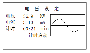 3. 試驗電壓范圍為5KV至額定值。(請不要設小于5KV的試驗電壓),它規定了我們所要升至的試驗電壓。儀器升至接近這個設定電壓值時,就不再升壓,并保持在這個峰值下進行等幅的正弦波輸出。