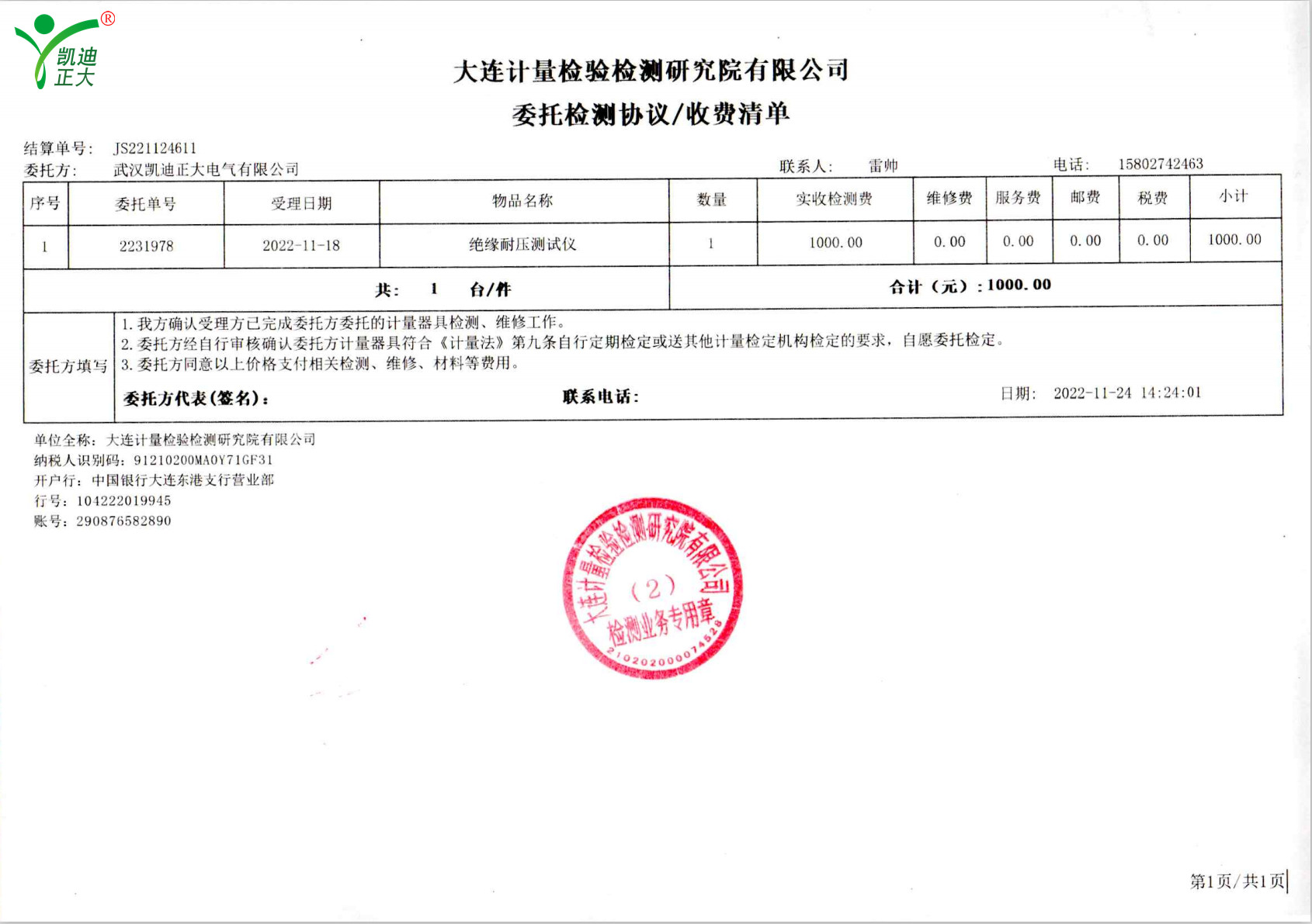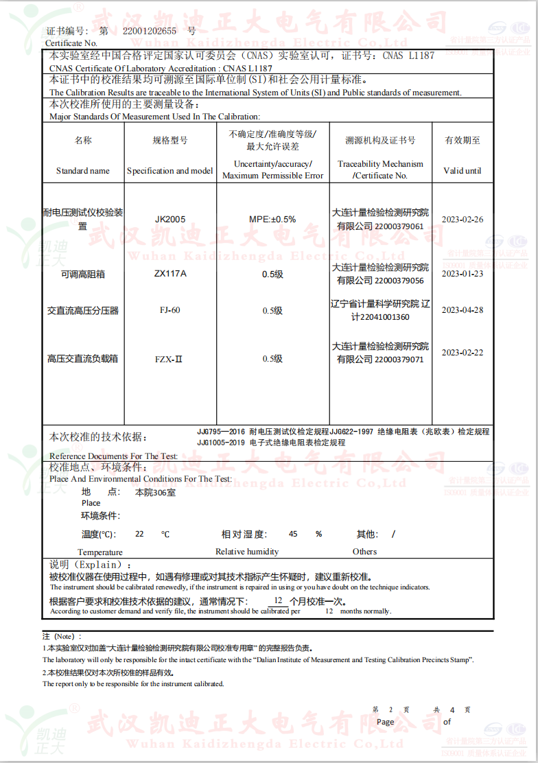 低壓成套開關(guān)柜KD7742智能耐壓絕緣測試儀根據(jù)公司制度標(biāo)準(zhǔn)需要獲得中國認(rèn)可國際互認(rèn)校準(zhǔn)CNAS檢定機(jī)構(gòu),大連計量檢驗(yàn)檢測研究院有限公司出具《KD7742智能耐壓絕緣測試儀校準(zhǔn)證書》,證書編號:第22001202655號;使用耐電壓測試儀校驗(yàn)裝置(溯源機(jī)構(gòu)大連計量檢驗(yàn)檢測研究院)、ZX117A可調(diào)高阻箱(溯源機(jī)構(gòu)大連計量檢驗(yàn)檢測研究院)、FJ-60交直流高壓分壓器(溯源遼寧省計量科學(xué)研究院)、FZX-II高壓交直流負(fù)載箱(溯源機(jī)構(gòu)大連計量檢驗(yàn)檢測研究院)等檢定設(shè)備。