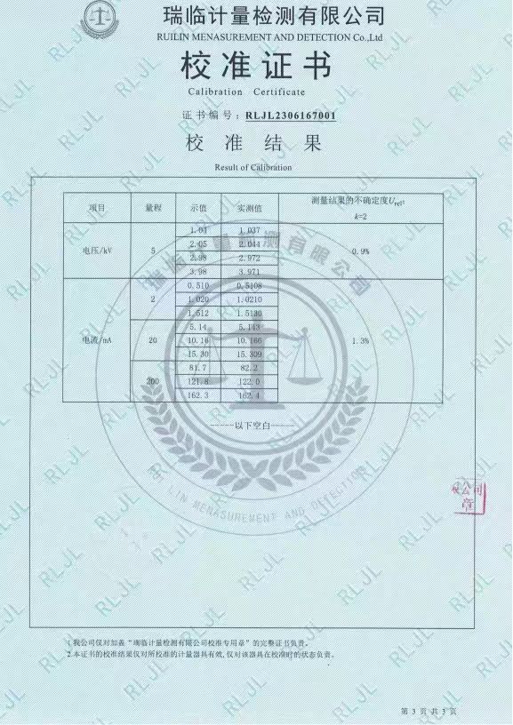 參照JJG 795-2016 耐電壓測試儀檢定規程檢定要求,KDYD2675 工頻高壓測試臺獲得證書RLJL2306167001檢定證書。