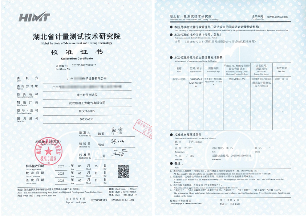 2025年7月11日,廣州某電子設(shè)備有限公司向武漢凱迪正大電氣采購(gòu)的KDCJ-20kV沖擊耐壓測(cè)試儀,通過(guò)湖北省計(jì)量測(cè)試技術(shù)研究院的專業(yè)校準(zhǔn),驗(yàn)證了測(cè)試儀的準(zhǔn)確性和可靠性。