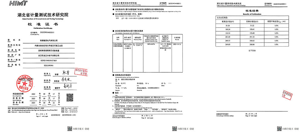 近日,包鋼集團電氣有限公司采購的KDXZ-540kVA/270kV變頻串聯(lián)諧振耐壓試驗裝置,經(jīng)湖北省計量測試技術(shù)研究院完成校準并正式頒發(fā)校準證書,標志著該裝置在高壓電氣試驗領(lǐng)域的測量準確性與可靠性獲得國家法定計量機構(gòu)的權(quán)威認可。