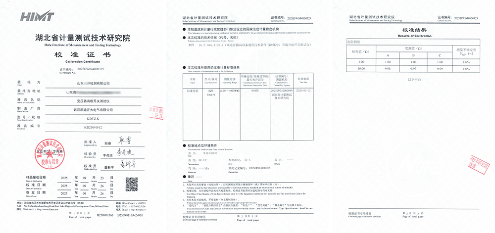 近日,山東某檢測有限公司引進了由武漢凱迪正大電氣有限公司生產(chǎn)的KDGK-F高壓開關機械特性測試儀與KDYZ-K變壓器有載開關測試儀,并委托湖北省計量測試技術研究院對兩款儀器進行了全面校準,均取得校準證書。